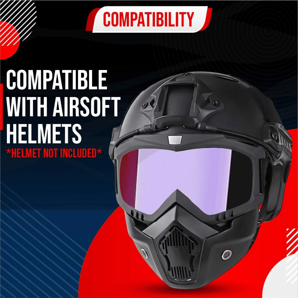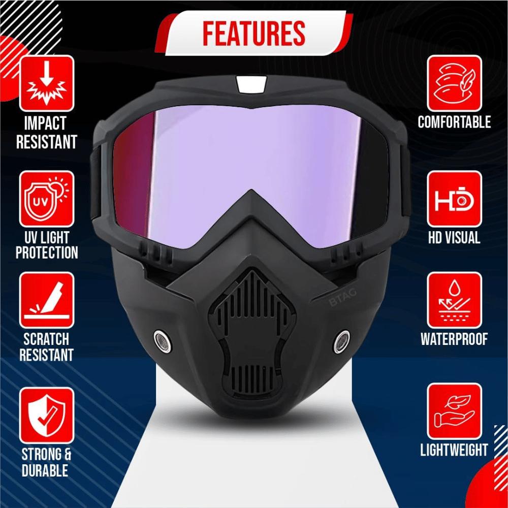 Ride with confidence using this full-face UV protective motorcycle mask with detachable goggles. Designed with an anti-scratch and anti-fog coating, it provides superior protection from dust, wind, and sunlight while ensuring clear vision and comfort during every ride.