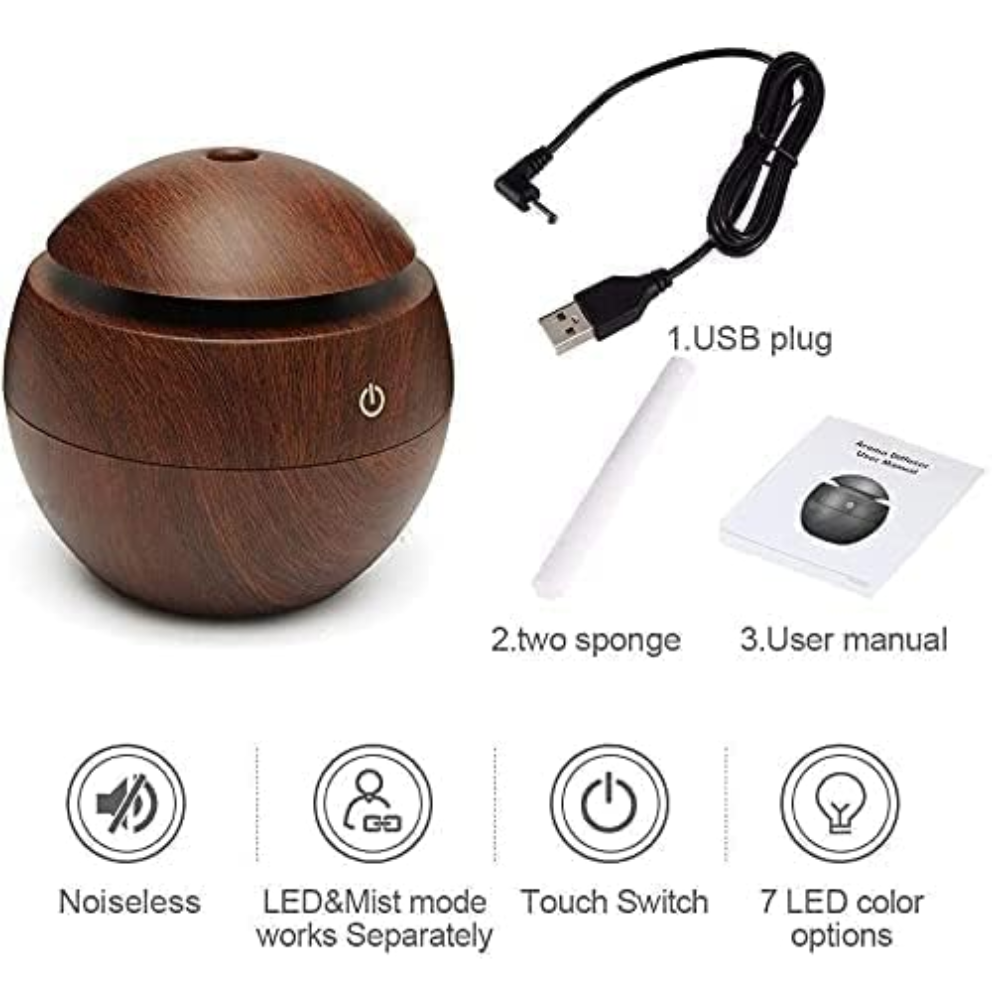 Wood Cool Mist Portable Ultrasonic Humidifier & Aroma Diffuser for Home and Office – Essential Oil Diffuser with Colorful LED Light and Auto Shut-Off